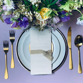 The water castle is nestled in the Loire region and one of our favorites to rent. The medieval fortress features beautiful Renaissance Architecture. In a castle like this you want the flowers to compliment the atmosphere of the building. The design color theme was created with a buttercup yellow rose and flowers in lavender tones. The gold used in the cutlery, vases, and seating plates makes this theme warm and inviting.